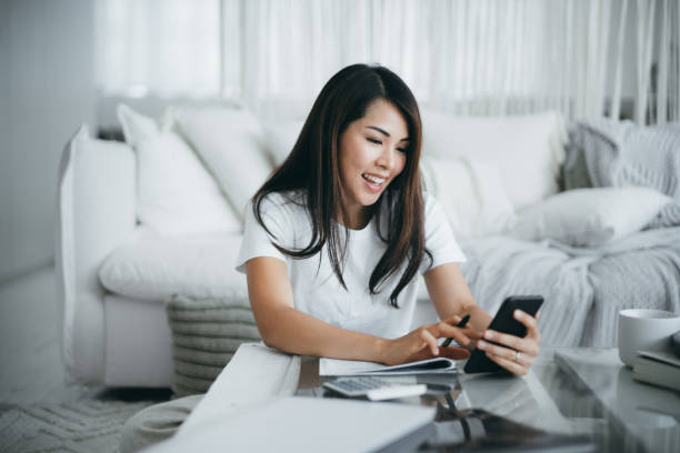 Young Asian woman sitting on the floor in the living room working from home using smartphone and handling paperworks
